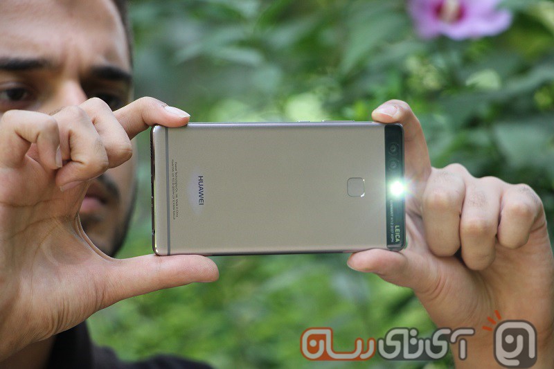 اگر دستگاه را به پشت برگردانید، نخستین چیزی که توجه شما را به خود جلب میکند یک مستطیل سیاه رنگ در بالاترین قسمت است. در این قسمت شاهد دو دوربین اصلی، فلاش LED دوگانه و نامی از کمپانی آلمانی Leica هستیم. این بخش کاملا از بدنه دستگاه جداست و توسط یک شیشه محافظت میشود. موردی که پیشتر در نکسوس ۶P دیده بودیم. البته این قسمت همچون یک آفتابپرست با توجه به رنگ دستگاه تغییر رنگ میدهد. به عنوان مثال اگر نسخه طلایی رنگ P9 را خریداری کنید این قسمت نیز طلایی خواهد بود. یک نکته مثبت در طراحی این مدل عدم بیرون زدگی دوربین است. هواوی با استادی تمام دوربینها را در بدنهای با ضخامت ۷ میلیمتر جا داده بدون آنکه حتی یک دهم میلیمتر بیرون زدگی داشته باشد و این در حالیست که سازندگان مطرحی همچون اپل و سامسونگ (حتی با ضخامتی بیشتر) نتوانستهاند چنین کاری را انجام دهند. حالا وقتی بدانید که با همه اینها کیفیت فدا نشده و حتی در برخی موارد دوربین محصول چینیها از برادران کرهای و آمریکایی هم بهتر است، انگشت به دهان خواهید ماند.