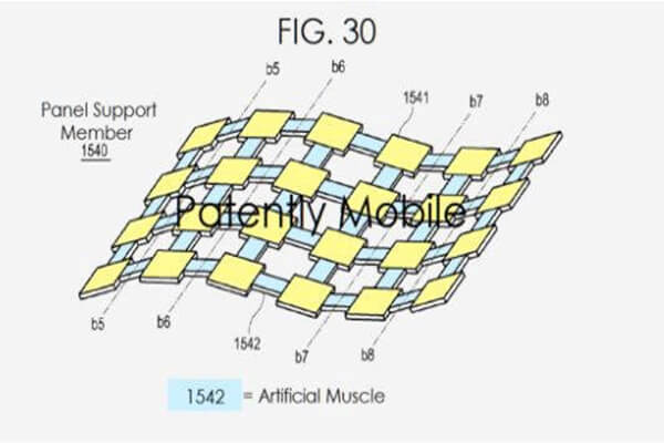 یکی از این پتنتها که “panel support member” نامیده میشود، یک صفحه منعطف را نشان میدهد که از مجموعهای از پنلهای الکترو مغناطیس و سیمهای ریز و محکم بین آنها تشکیل شده است. این ساختار به نوعی عضله مصنوعی تولید کرده و این مجموعه را قادر میسازد تا به هر شکلی درآید. با پشتیبانی این مجموعه از صفحات منعطف OLED به عنوان نمایشگر اصلی، میتوان ابزارهایی مانند تلفنهای تاشو که به تلفنهای بزرگتر یا تبلتها تبدیل میشوند، یا تبلتهای تاشو که به گوشی تبدیل میشوند را تولید کرد. حتی میتوان این تبلتها را به گونهای تا کرد که لپتاپی در ابعاد یک پاکت نامه ایجاد شود.