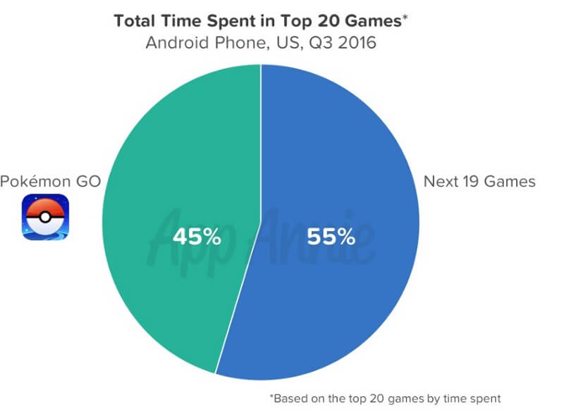 اما آمار جالب دیگری نیز در این گزارش میتوان یافت. بر اساس این گزارش، ۴۵ درصد از زمان بازی بر روی گوشیهای اندروید به این بازی اختصاص داشته است. ۱۹ بازی دیگر روی هم رفته، ۵۵ درصد زمان را به خود اختصاص دادهاند. اما این زمان از بازیهای دیگر به سرقت نرفته است. کسانی که از پوکمون گو استفاده میکنند، معمولا بازی نمیکنند.