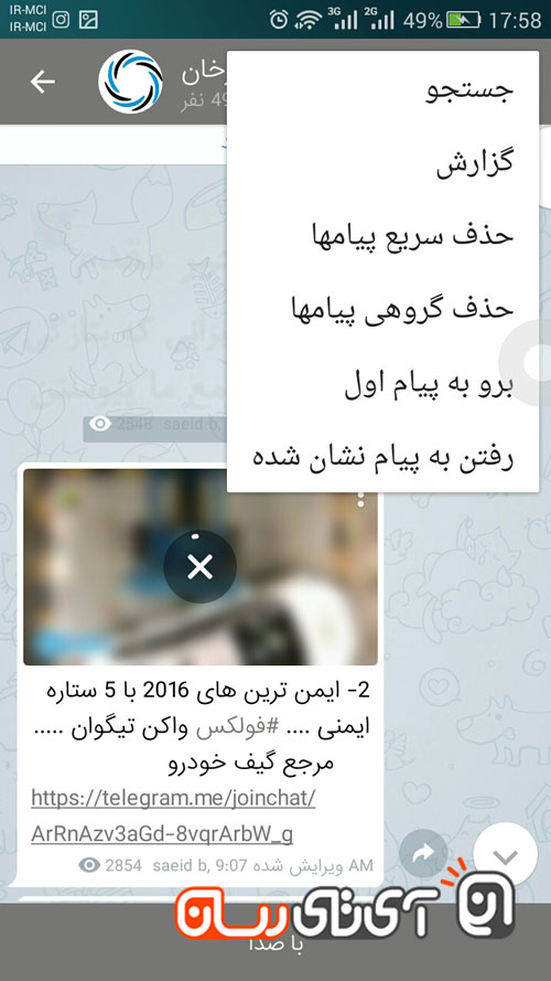 اما اگر تمایل به فوروارد کردن پیامی داشته باشید، تنها با یکبار لمس پیام مورد نظر، لیستی از امکانات خاص آنگرام برای شما نمایان میشود. امکاناتی مانند فوروارد، فوروارد بدون نقل قول، فوروارد با ویرایش و … که در تصویر زیر مشاهده مینمایید.
