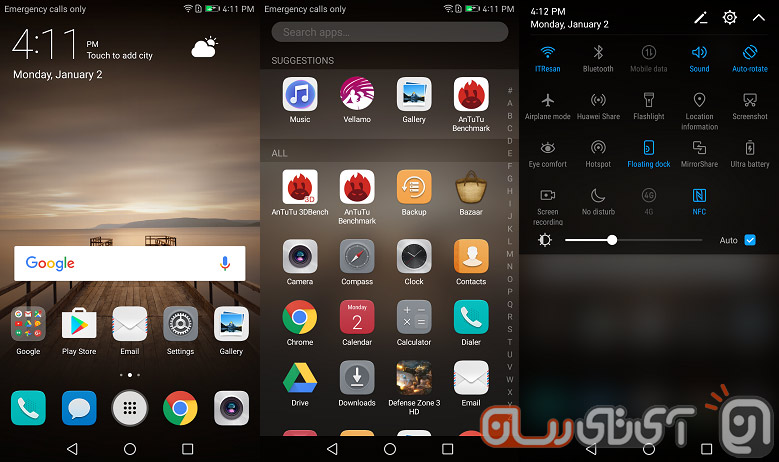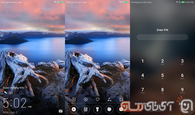 با همه اینها رابط کاربری هواوی علیرغم تمام جذابیتهایش، شبیه به اپل است! این شباهت از همان لاکاسکرین آغاز میشود. اگر در این قسمت انگشت خود را از پایین به سمت بالا بکشید با یک منو کوچک روبهرو میشوید و بدون آنکه نیازی به باز کردن قفل دستگاه باشد، میتوانید از ماشین حساب و یا تایمر استفاده کنید، وارد رکوردر شوید و صدایی را ضبط کنید، از چراغ قوه بهره بگیرید و یا اینکه توسط دوربین یک QR Code را اسکن کنید.
