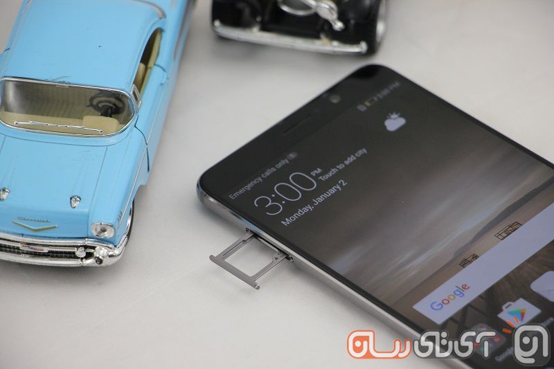 در سمت راست دستگاه شاهد کلیدهای یکپارچه صدا و پاور هستیم. البته اینجا هم به واسطه سایز بزرگ میت ۹ کم و یا زیاد کردن صدای اسپیکرها کمی دشوار است و بهتر بود که هواوی چارهای هم برای این مورد میاندیشید؛ مثلا میتوانست خیلی راحت با انتقال کلیدهای یکپارچه صدا به زیر کلید پاور این مشکل را هم حل کند و قال قضیه را بکند. در بخش بالایی سمت چپ دستگاه، تنها درگاه سیمکارت و کارت حافظه به چشم میخورد که طبق معمول میبایست با یک سوزن، پایه فلزی مربوطه را از جایگاه ابدیاش خارج کنید.