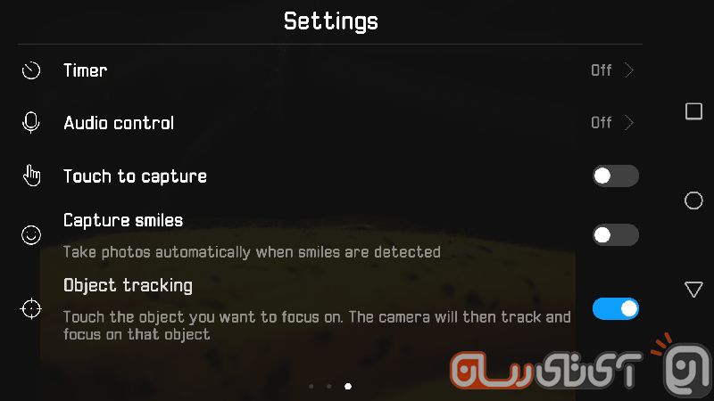 در بخش تنظیمات میتوانید صدای شاتر دوربین را بهراحتی قطع کنید، موردی که برای انجام آن در برخی اسمارت فونها میبایست هفت خان رستم را رد کرد! با استفاده از Audio Control این توانایی را دارید تا مشخص کنید که بدون لمس صفحه و تنها با گفتن یک کلمه خاص همچون Cheese، میت ۹ از محیط عکس بیندازد. خب پیشتر نیز شاهد چنین بخشی در محصولات سایر کمپانیها بودیم اما در این قسمت میت ۹ یک گزینه خاص را در اختیار شما میگذارد تا با به صدا در آمدن هر چیزی، گوشی مشغول عکاسی شود! در این حالت صدای محیط فاکتور گرفته میشود و کافی است شما هر چه که دوست دارید بگویید تا میت ۹ عکس بیندازد (اصلا شما سوت بزن، اون خودش عکس میندازه)! هنگام فعال بودن این قابلیت، کلید شاتر دوربین نیز با یک افکت زیبا نشان میدهد که دستگاه منتظر فرمان شماست. کمی پایینتر به گزینه Touch to Capture بر میخوریم که با فعال کردن آن تنها کافی است انگشت خود را بر روی سوژه بزنید تا دوربین پس از اعمال فوکوس از آن عکس بیندازد. گزینه دیگر Capture Smiles نام دارد که برای افراد خوش خنده است و با فعال کردن آن زمانی که دوربین لبخند شما را تشخیص دهد، به صورت اتوماتیک عکس میاندازد.