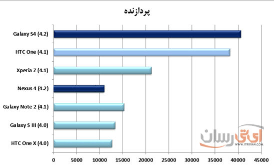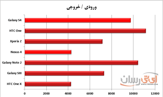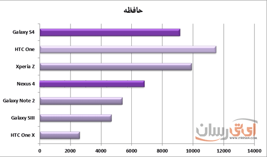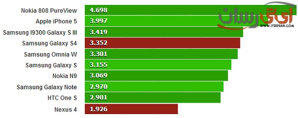 با توجه با عکس بالا که براساس نسبت کنتراست گوشیها دسته بندی شده است، مشاهده میکنید که گلکسی اس4 با اختلاف نسبتا زیادی بالاتر از رقیب خود در این مسابقه قرار گرفته است.