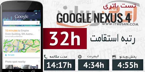 میزان نگهداری شارژ همیشه یکی از اولویتهای خرید برای بسیاری از افراد است، جایی که اگر ذرهای قدرت باتری یک اسمارتفون از دیگری بیشتر باشد، میتواند از تمام معایب آن نسبت به دیگر اسمارتفونها چشم پوشی کرده و فقط به دلیل شارژ دهی مناسبتر، یک اسمارتفون را برگزینید. گلکسی اس4 با یک باتری 2600 میلی آمپرساعتی پا میدان گذاشته است در سوی دیگر نکسوس 4 با باتری 2100 میلی آمپر ساعتی قصد رقابت با اس4 را دارد. از لحاظ آمار و ارقام اس4 باتری قدرتمند تری را داراست اما با توجه به عکس زیر میتوان دریافت که گرچه از لحاظ میزان نگهداری شارژ و حجم باتری اس4 وضعیت بهتری دارد، اما هنگام مکالمه وضعیت نکسوس 4 به مراتب بهتر خواهد بود. این بدان معناست که نماینده الجی هنگام برقراری مکالمه کمترین شارژ را از باتری دستگاه گرفته و این گوشی برای افرادی که بیشتر وقت خود را صرف مکالمه میکنند، در یک کلام عالیست! اما در مقابل نکسوس ۴ در زمان پخش ویدئو حرفی برای گفتن ندارد و در کل باتری گلکسی اس۴ برا آن میچربد.