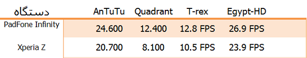 اکسپریا زد از چیپست SnapdragonS4pro استفاده کرده ولی پدفون از نسل جدید همان چیپ یعنی Snapdragon600 استفاده میکند. پردازنده هر دو چهارهستهای و اکسپریا زد با فرکانس 1.5 گیگاهرتز و پدفون با فرکانس 1.7 گیگاهرتز است و میتوان گفت نوع آنها به طرز فاحشی متفاوت است، زد با Krait 100 و پدفون با Krait 300؛ رم هر دو گوشی 2 گیگابایت است و نوع و مشخصات آنها نیز تفاوتی ندارد، حداقل بر روی کاغذ این طور است. برای انجام پردازشهای گرافیکی نیز هر دو از واحد گرافیکی Adreno 320 با فرکانس و توان و در کل مشخصات مشابه بهره میبرند و تنها تفاوت “روی کاغذ” این دو چیپست کنترل کننده قطعات و پردازنده مرکزی آنهاست اما برای دیدن کارکرد آنها در عمل باید به بنچمارکها نگاهی بیندازیم: