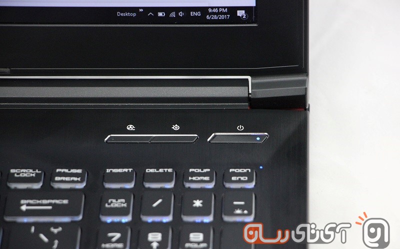 در بالای کیبورد شاهد ۳ دکمه دیگر هستیم که یکی از آن‌ها همان کلید پاور همیشگی لپ‌تاپ‌هاست و دو دکمه دیگر که به صورت یکپارچه طراحی شده‌اند، مربوط به تغییر رنگ نور پس زمینه و کنترل فن دستگاه می‌شوند.