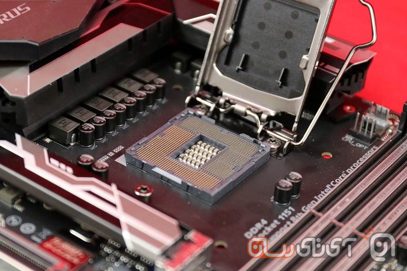 در کنار سوکت، 4 ماژول رم دیده میشود که با استیل ضدزنگ مقاوم شدهاند و از 64 گیگابایت رم non ECC UnBuffered و ECC UnBuffered از سرعتهای 2133/2400/2666 پشتیبانی کرده و با اورکلاک میتوان تا سرعت 4133 نیز از آنها استفاده کرد. در کنار این اسلاتها شاهد 2 کلید پاور و DC هستیم که برای روشن کردن و اورکلاک خودکار میتوان از آنها سود برد.
