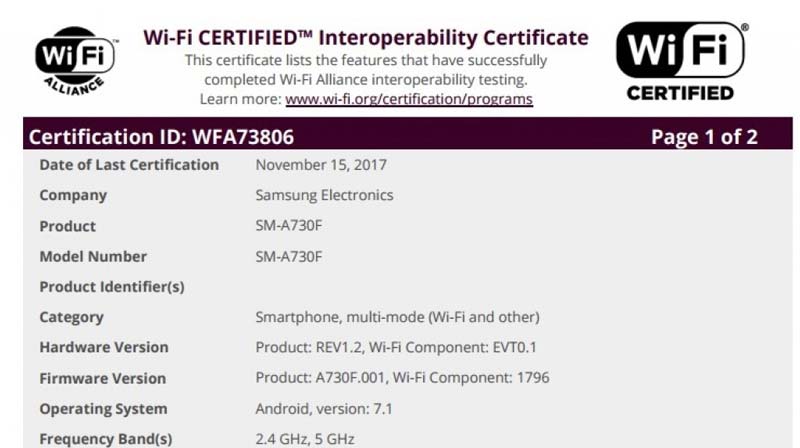اتحادیه وایفای بهتازگی دو گواهی جدید برای محصولاتی با شماره مدل SM-A530F و SM-A730F صادر کرده که به ترتیب معرف دو گوشی هوشمند سامسونگ گلکسی (A5 (2018 و گلکسی (A7 (2018 است.