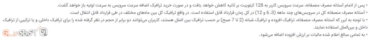 همچنین لازم به ذکر است تمامی محاسبات انجام شده در این مطلب، با تعرفه اصلی خدمات بوده و هزینههای مالیات و دایری محاسبه نشده است. همچنین ترافیک محاسبه شده در سرویسها، ترافیک بینالمللی بوده و در صورت استفاده از ترافیک داخلی، همه حجمهای مطرح شده دوبرابر میشود.
