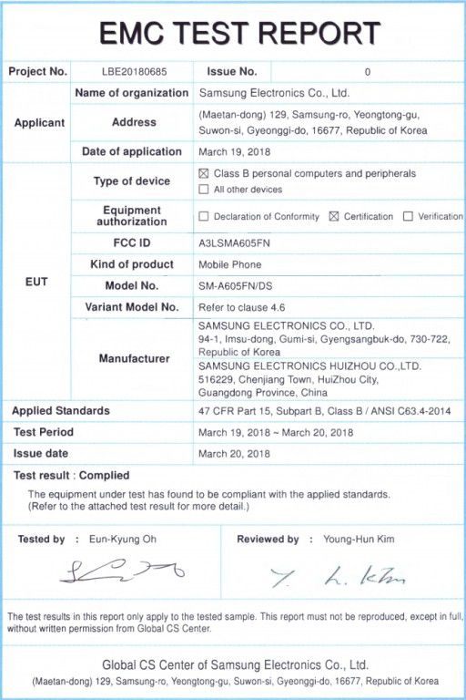 این تاییدیه برای دو اسمارتفون A3LSMA605FN و A3LSMA600FN صادر شده است که به وضوح نشان دهنده معرفی این دو اسمارتفون تحت نامهای گلکسی A6 و گلکسی A6 پلاس است. حتی در اسکرینشاتهای منتشر شده از این دو اسمارتفون میتوانیم نام گلکسی A6 را نیز مشاهده کنیم.