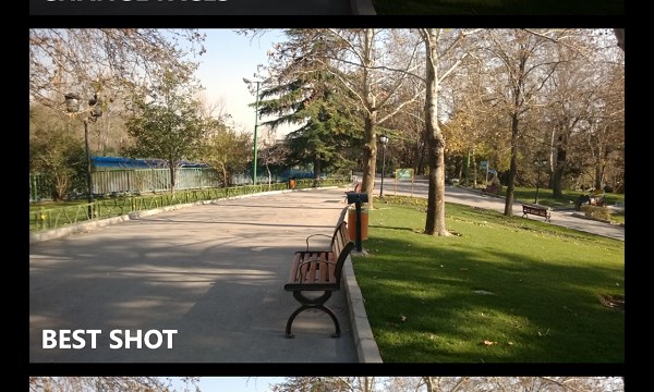 هنگامی که آیکون دوربین را به سمت پایین میکشید وارد بخش جذابی به نام اسمارت خواهید شد که خود دارای چندین بخش مجزاست. برای نشان دادن تمامی قابلیتهای این بخش از دوست عزیزی خواستیم که از روی یکی از صندلیهای پارک بپرد! ما نیز در موقعیتی مناسب مشغول عکسبرداری شدیم. پس از فشردن دکمه شاتر چیزی در حدود 10 -12 عکس از سوژه مورد نظر ثبت شده و سپس وارد تنظیمات بخش Smart نرم افزار شدیم. ابتدا بخشی به نام Best Shot وجود دارد که بهترین عکس را از میان مجموعه عکسهای گرفته شده انتخاب کرده و نمایش می دهد.