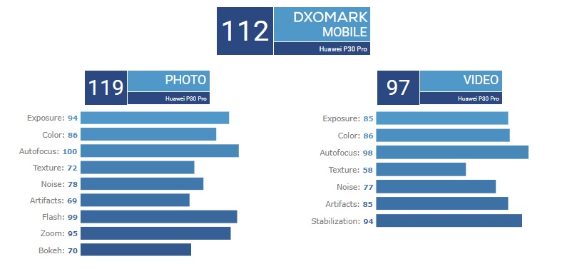 وبسایت DxOMark ساعاتی پس از معرفی رسمی هواوی P30 پرو، نتایج بررسی دوربین آن را منتشر کرد که این گوشی با امتیاز کلی ۱۱۲ بالاتر از گلکسی S10 پلاس، میت ۲۰ پرو و P20 پرو (با امتیاز ۱۰۹) در صدر جدول بهترین دوربین گوشیهای هوشمند قرار گرفت و رکورد امتیاز در این سایت را شکست. پیش از این هواوی سال گذشته با P20 پرو توانسته بود رکوردشکنی کرده و برای اولین بار یک گوشی در DxOMark به امتیاز 109 رسید و تا همین امروز هیچ شرکتی نتوانسته بود از این امتیاز عبور کند.
