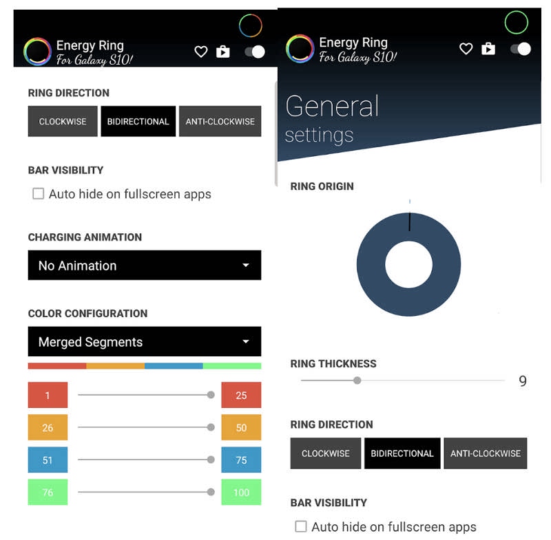 Energy Ring گزینههای شخصی سازی مختلفی از قبیل تغییر ضخامت حلقه، جهت نمایش تخلیه باتری و همچنین انتخاب رنگهای مختلف متناسب با میزان شارژ باتری را در اختیار کاربران خود میگذارد.