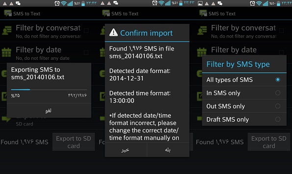 بدون شک یکی از بخشهای مهم در گوشی، Messaging نام دارد زیرا اساماس های موجود در این بخش به راحتی بدست نمیآیند و علاوه بر هزینه مدت زمان زیادی نیز صرف جمعآوری آنها میشود بنابراین تهیه یک نسخه پشتیبان از آنها امری ضروری است. SMS To Text نام برنامهای است که بوسیله آن میتوانید تمامی اساماس های موجود در گوشی خود را به یک فایل متنی تبدیل کنید و به راحتی آنرا در کامپیوتر ذخیره و یا به ایمیل خود ارسال کنید. تنظیمات گستردهای نیز در اختیار شماست و میتوانید آنها را بر اساس تاریخ ارسال و یا دریافت آنها ذخیره کنید. از جمله مهمترین قابلیتهای این برنامه این است که پس از استخراج اساماس ها میتوانید آنها را دوباره به گوشی خود بازگردانید.