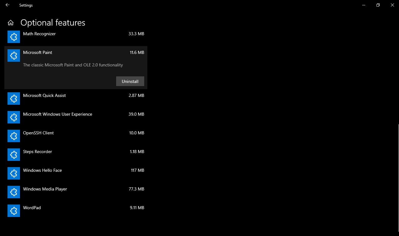 در آخرین آپدیت ویندوز 10 با شماره ساخت 18963، نرمافزارهای WordPad و Microsoft Paint در لیست بخش قابلیتهای اختیاری (Optional Features) قرار میگیرند و این امر به معنی قابل حذف بودن اپلیکیشنهای مذکور است. بنابراین، کاربران به راحتی میتوانند در صورت عدم نیاز به این دو نرمافزار نسبت به حذف آنها اقدام کنند.