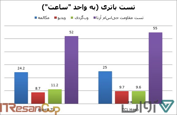 با توجه به حجم بیشتر باتری و نمایشگری کوچکتر، وان تاچ هیرو در تستهای مکالمه و پخش ویدیو با فاصلهای کوتاه از زد اولترا جلو میافتد، اما در مقابل عملکرد وبگردی در ZU تا حدودی بهتر است.