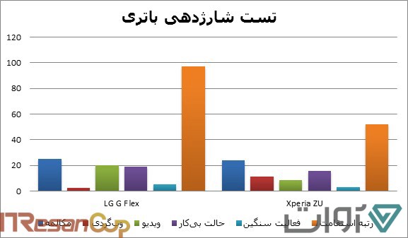 پس از 70دقیقه دوندگی، وقتِ آن است که ببینیم دو مدل از لحاظ ذخیره انرژی و دوام استقامتی، چگونه عرض اندام کردهاند! سونی در زد اولترا، به سبب ضخامت بسیار پایین یک باتری 3050میلیآمپری قرار داده که البته طول عمر مناسبی هم دارد. در حالی که الجی از فرصت استفاده کرده و علاوه بر تولید اولین باتری خمیده جهان، آن را به ظرفیت 3500میلیآمپر مجهز کردهاست! وقتی نگاهی به نمودار نگهداری شارژ دو دستگاه نگاه میکنیم، نتایجی معادل زیر را به چشم میبینیم!
