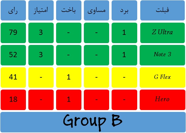 نظر شما در رابطه با این گروه چیست ؟ آیا زد اولترا میتواند با غلبه بر گلکسی نوت3 سامسونگ جایگاهش را در جدول رقابتها تثبیت کند؟ برنامه کامل مسابقات را میتوانید از اینجا مشاهده کنید!