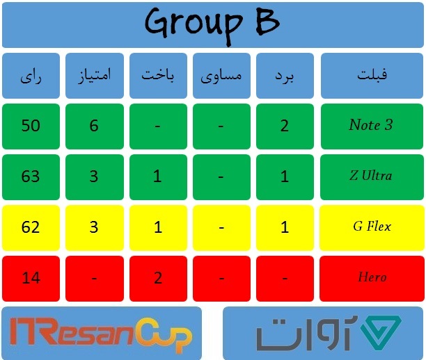 در نخستین بازی از دور دوم رقابتهای این گروه که از حساسیت بالایی برخوردار بود؛ گلکسی نوت3 از سامسونگ بالاخره توانست در نبردی دشوار اکسپریا زد اولترای سونی را شکست دهد! این رقابت ابتدا با حملات طوفانی زد اولترا آغاز شد و در همان لحظات ابتدایی نماینده سونی توانست با اختلافی بیش از 30 درصدی در کسب آرا، از رقیب خود پیشی بگیرد اما طرفداران سامسونگ با دیدن این صحنه به خود آمدند و توانستند با حداقل اختلاف (کمتر از یک درصد) بازی را به سود خود به پایان برسانند.