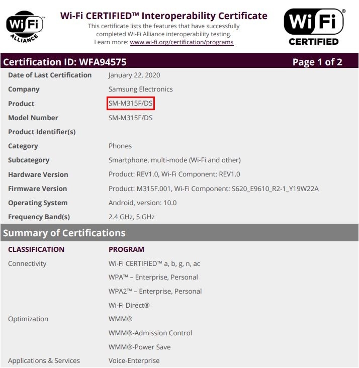 با مشاهده لیست موسسه Wi-Fi Alliance متوجه شدیم که نرمافزار هر سه تلفن میانرده سامسونگ توسط سیستمعامل اندروید 10 اجرا میشود. اسمارتفون گلکسی M11 با شماره مدل SM-M115F/DS، گلکسی A11 با شماره مدل SM-A115F/DS و هندست M31 نیز با شماره مدل SM-M315F/DS معرفی خواهد شد. دو تلفن اول از وایفای تکبانده با فرکانس 2.4 گیگاهرتز و گلکسی M31 از وایفای دوبانده پشتیبانی میکنند.