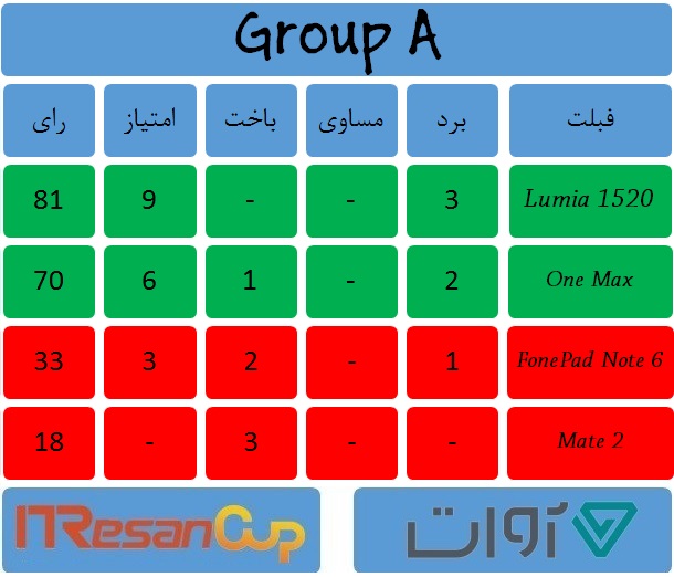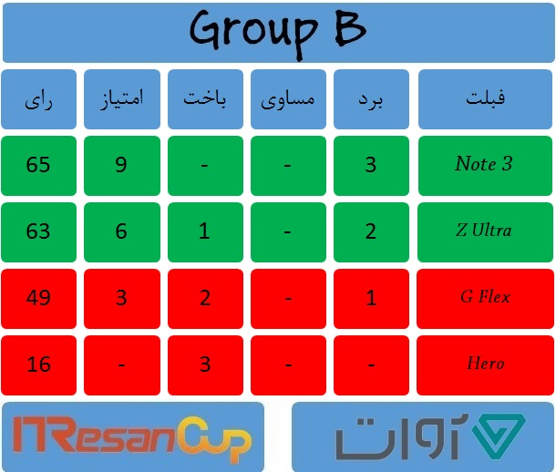 سرانجام پس از 12 بازی حساس و نفسگیر، سرنوشت 4 فبلت صعود کننده به مرحله حذفی جام قهرمانان آیتیرسان مشخص شد. رقابتهایی که در آن شگفتیهایی نیز به همراه داشت و متفاوتترین فبلت جام یعنی الجی جیفلکس علیرغم، محبوبیت فرآوانی که داشت نتوانست از سد زد اولترا و گلکسی نوت سامسونگ بگذرد و در نهایت با دو باخت نسبتا سنگین وداع تلخی با جام داشت و از صعود به مرحله بعد بازماند! در جدولهای زیر نتایج پایانی گروههای جام قهرمانان آیتیرسان ویژه فبلتها را مشاهده میکنید.