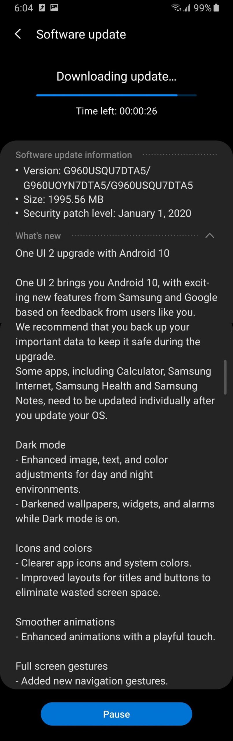 بروزرسانی اندروید 10 برای گلکسی S9 و S9 پلاس با حجمی بین 1.8 تا 2 گیگابایت و به همراه پچ امنیتی ماه ژانویه انتشار یافته است. از مهمترین قابلیتهای آپدیت جدید میتوان به حالت تاریک در سراسر محیط سیستم، ژستهای حرکتی جدید، فیلمبرداری از صفحهنمایش، بهبود قابلیتهای مربوط به حریم شخصی و نوتیفیکیشنها اشاره کرد. این آپدیت طی هفتههای آینده در مناطق بیشتری از جهان در دسترس کاربران قرار میگیرد.