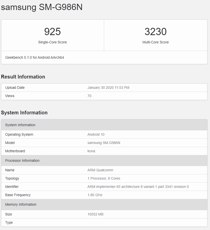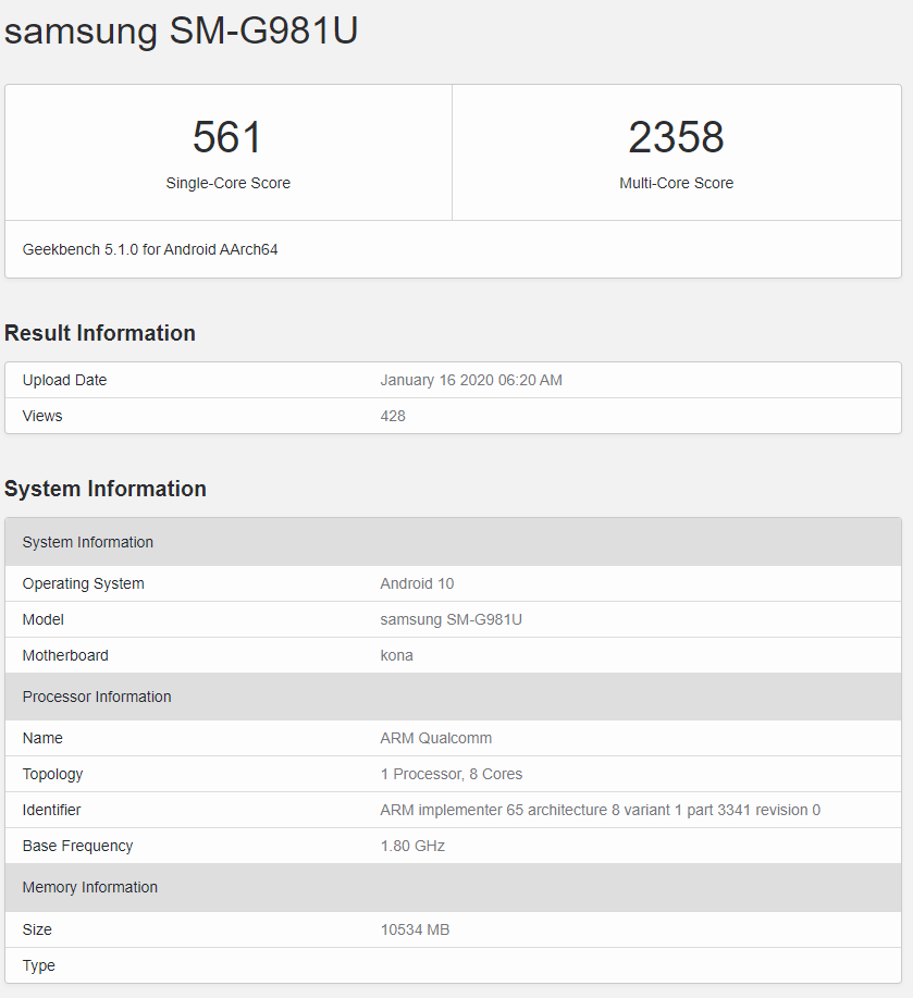 سه اسمارتفون گلکسی S20 با شماره مدل SM-G981 (گلکسی S20)، SM-G986 (گلکسی S20 پلاس) و SM-G988 (گلکسی S20 الترا) در گیکبنچ رویت شدهاند. مدلهای دارای حرف N متعلق به بازار کره جنوبی و مدلهای با حرف U برای بازار ایالات متحده آمریکا در نظر گرفته شدهاند. احتمال میدهیم که مدل دارای حرف F نیز مختص بازار اروپا باشد.