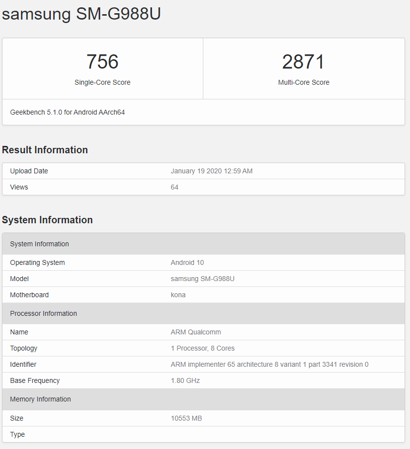سه اسمارتفون گلکسی S20 با شماره مدل SM-G981 (گلکسی S20)، SM-G986 (گلکسی S20 پلاس) و SM-G988 (گلکسی S20 الترا) در گیکبنچ رویت شدهاند. مدلهای دارای حرف N متعلق به بازار کره جنوبی و مدلهای با حرف U برای بازار ایالات متحده آمریکا در نظر گرفته شدهاند. احتمال میدهیم که مدل دارای حرف F نیز مختص بازار اروپا باشد.