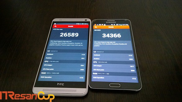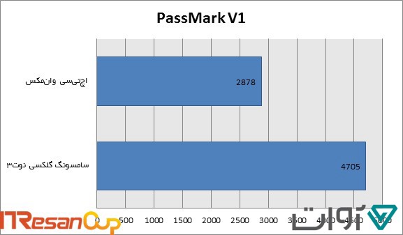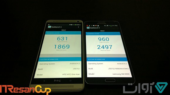 پس از پایان نیمه اول با شرایطی نسبتا آرام و بدون برتری فاحش هیچیک از دو رقیب، حال وقت آن است تا در نیمه مربیان هردو فبلت را به یک چالش واقعی دعوت کنیم تا ببینیم کدامیک در شرایط دشوار توانایی بالاتری در حفظ بازی و رقم زدن نتایجی بهتر دارند. این دقایق کاملا وابسته به توان بدنی دو تیم دارد، چرا که قرار است در آزمایشگاه آیتیرسان آنها را تحت سختترین تستهای ممکن قرار دهیم. همانطور که متوجه شدید میخواهیم سختافزار این دو حریف را مورد بررسی قرار دهیم و ابتدا این کار را با مقایسه ویژگیهای روی کاغذ آنها آغاز میکنیم. نوت3 که در این بخش خیلی مصمم به نظر میرسد دارای دو نسخه است. یکی با چیپ ساخت سامسونگ با نام اگزینوس و دیگری با چیپ قدرتمند ساخت کوالکام با نام Snapdragon 800 که نوت3 ما از نوع سوم است. چیپ بکاررفته در وانمکس یک نسل قدیمیتر از چیپهای کوالکام است که همه آن را با نام Snapdragon 600 میشناسیم. این برتری نوت3 هنگامی بیشتر احساس میشود که متوجه شوید میزان رم این فبلت 3گیگ است، درحالی که رم وان مکس 2گیگابایت است. حافظههای داخلی مختلفی توسط هردو گجت ارایه میشود و هردو هم توانایی پشتیبانی از کارت حافظه جانبی را نیز دارند. بیایید نگاهی به بنچمارکهای دو فبلت بیاندازیم تا ببینیم در عمل چه خواهند کرد.