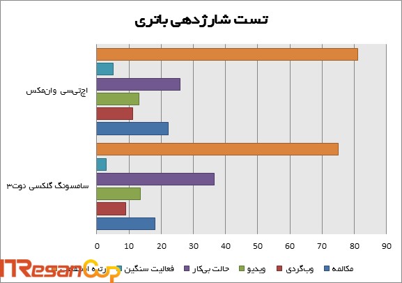 پس از اینکه دو فبلت تمام تلاش خود را برای سرگرم کردن ما انجام دادند، حال خیلی خسته به نظر میرسند. جا داره همینجا از هر دو قدردانی و البته عذرخواهی کنیم! به همین دلیل فبلتها از ما خواستند تا آنها را یک بار کامل شارژ کینم تا ببینیم بازده واقعی باتری هر یک درچه حد است. در حین اینکه دو فبلت ما در شارژ هستند اجازه بدهید نگاهی به ظرفیت باتری آنها بیاندازیم. باتری نوت3 از نوع لیتیوم-یون است و ظرفیتی معادل 3200 میلیآمپر و باتری وان مکس هم لیتیوم- پلیمری و دارای ظرفیتی برابر با 3300 میلیآمپر است. البته با نگاه به هیکل وان مکس عدد بسیار بیشتری را میتوان متصور شد ولی در عمل چنین چیزی مشاهده نمیشود. زمانی که دو رقیب آماده شدند و آنها را تحت تستهای مختلف از جمله مکالمه، وبگردی و تماشای ویدیو قرار دادیم نتایج زیر بدست آمدند.