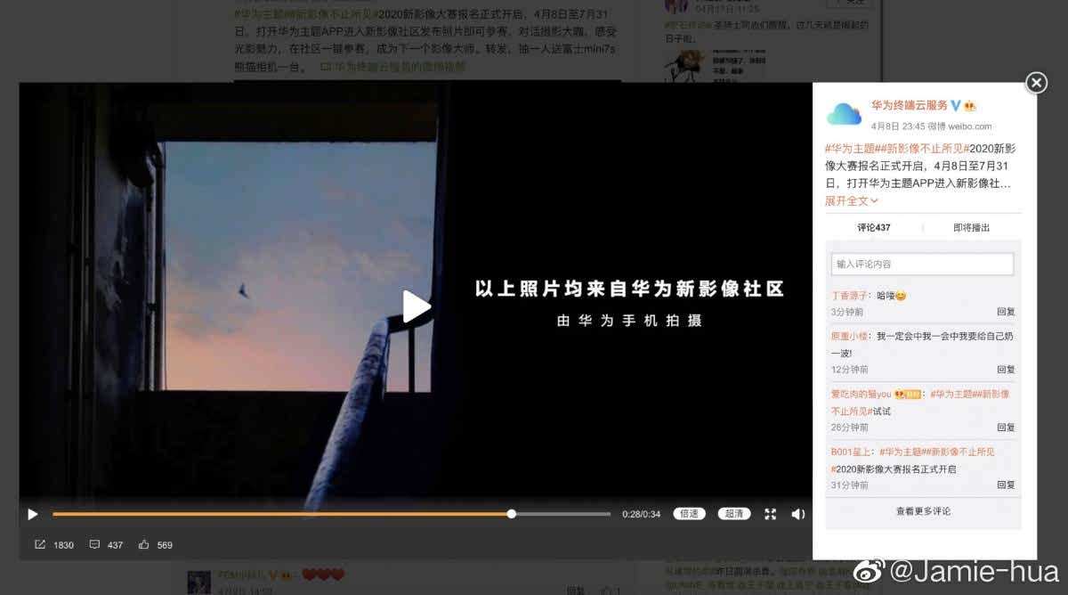 هواوی بهتازگی برای تبلیغ مسابقه عکاسی موبایلی خود در ویبو، یک ویدیوی تبلیغاتی از تصاویر زیبای گرفتهشده با دوربین گوشیهایش گذاشته بود. اما کاربری به نام Jamie-hua که در سال 2018 نفر دوم مسابقه عکاسی آیفون شده بود، متوجه میشود که یکی از عکسهای ویدیوی تبلیغاتی هواوی جعلی است.