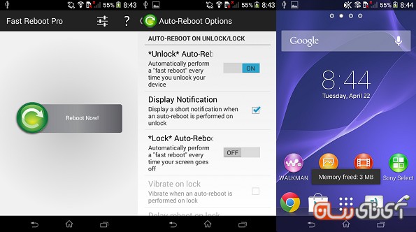 Fast Reboot Pro برنامهای ساده، کم حجم و در عین حال بسیار کاربردی است که توسط آن قادر خواهید بود تا سرعت گوشی خود را افزایش دهید! هنگامی که وارد برنامه شوید با گزینهای به نام ReBoot now مواجه خواهید شد و پس از فشردن آن، تمامی برنامههای گوشی شما بسته شده و دوباره باز میشوند؛ در نتیجه مقداری از رم گوشی خالی شده و موجب افزایش سرعت گوشی میشود! این عمل دقیقا همانند ریست کردن گوشی است، با این تفاوت که به سرعت انجام گرفته و دیگر گوشی شما خاموش نخواهد شد. در بخش تنظیمات برنامه میتوانید تعیین کنید که در یک ساعت مشخص، گوشی شما Fast ReBoot شود و یا اینکه پس از هر بار آنلاک کردن گوشی این عمل انجام گیرد! با این کار بدون اینکه وارد برنامه شوید، تنها با آنلاک کردن گوشی خود یکبار همه برنامهها را بسته و بازکردهاید. برای اجرای این برنامه به اندروید 2.2 و بالاتر نیاز دارید!