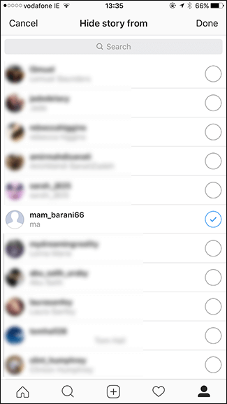اکنون میتوانید لیستی از تمامی فالورهای فعلی خود را مشاهده کنید. حسابی را که نمیخواهید استوری شما را مشاهده کند، پیدا کرده و سپس تیک کنار نام آن را فعال کنید. در نهایت کلید “Done” را لمس کنید. اکنون دیگر حسابهای انتخاب شده، نمیتوانند استوریهای شما را مشاهده کنند.