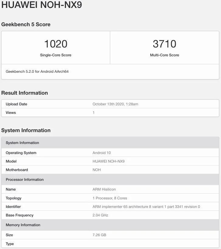 فهرست گیکبنچ نشان میدهد که میت 40 پرو دارای شماره مدل NOH-NX9 بوده و توان پردازشی آن از طریق تراشه کاملا جدید کایرین 9000 تامین میشود. با اینحال به نام تراشه مورد استفاده هیچ اشارهای نشده است. توان پردازشی این اسمارتفون در زمینه گرافیکی نیز توسط پردازنده Mali-G78 تامین میشود.