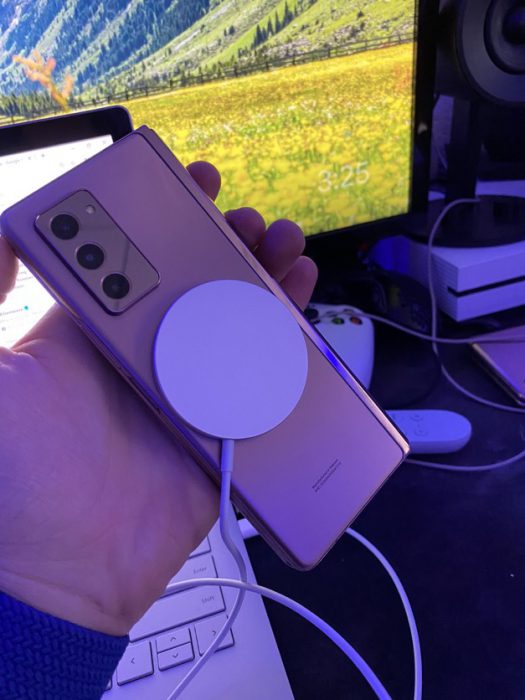 وی از گوشی تاشوی خود و اتصال مناسب شارژر جدید MagSafe به آن تصاویری را منتشر نموده است. با اینحال در صورت کشیدن شارژر با کمی فشار اتصال آن با دستگاه قطع خواهد شد. همچنین در خصوص سرعت دقیق شارژ گوشی نیز جزئیات خاصی منتشر نشده است؛ اگرچه تصور میشود که این سرعت به 7.5 وات محدود خواهد بود؛ زیرا در تبلیغات اخیر صرفا به قابلیت دستگاههای سری آیفون 12 در دستیابی به سرعت شارژ 15 واتی اشاره شده است.