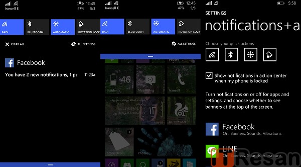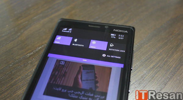 در ویندوزفون8 خبری از نوتیفیکشن سنتر و یا اکشن سنتر نبود! این بدان معناست که اگر شما در حال کار با گوشی خود بودید و تصمیم به روشن کردن وایفای داشتید، نمیتوانستید چنین کاری را به سرعت انجام دهید (!) و میبایست وارد بخش تنظیمات شده و از قسمت وایفای اقدام به روشن کردن آن کنید! اما در ویندوزفون 8.1 میتوانید با کشیدن انگشت از بالای صفحه به سمت پایین در هرجایی به بخشهای پرکاربرد و اصلی نظیر بلوتوث، وایفای و… دستیابید!