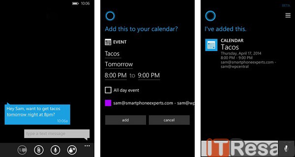 اگر شخصی برای شما اساماس و یا ایمیلی بفرستد و در آن تاریخ و یا زمانی را جهت انجام کاری مشخص کرده باشد، کورتانا این قابلیت را دارد که آن قرار را در تقویم شما ثبت کرده و قبل از آن به شما یادآوری کند.