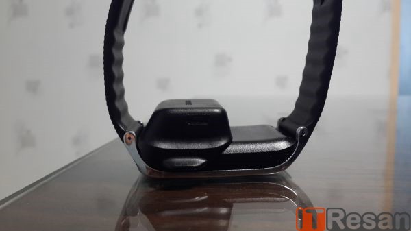 بند ساعت به راحتی تغییر سایز داده و میتوانید آن را متناسب با دست خود تنظیم کنید! در زیر نمایشگر، تک دکمه فلزی خانه قرار گرفته و در بالا نیز یک دوربین به همراه پورت اینفرارد، جای خوش کرده است. بر خلاف نسخه قبلی و کهکشانی این ساعت که دوربین بر روی بند آن قرار داشت، در این نسخه جدید و زمینی، دوربین بر روی بدنه ساعت قرار گرفته که همین امر موجب شده تا بند ساعت قابل تعویض باشد. زیر ساعت با یک روکش پلاستیکی پوشیده شده و یک سنسور ضربان قلب و چند نقطه فلزی دیده می شود، اما هرچه گشتیم خبری از پورت میکرو یواسبی برای شارژ دستگاه نبود! بله درست خواندهاید، همان چند نقطه فلزی جهت اتصال مبدلی به ساعت است تا بتوان آن را به وسیله پورت میکرو یواسبی شارژ کرد، در نتیجه شما بدون آن مبدل قادر به شارژ دستگاه خود نیستید! این مبدل بسیار ضخیم بوده به طوری که اگر از زوایا به آن نگاه کنید متوجه میشوید که حتی از خود ساعت نیز ضخیمتر است. بنابراین نمیتوانید ساعت را به همراه مبدل آن به دست خود ببندید و اگر قصد سفر دارید و یا دایما در حال جابه جایی هستید، میبایست این مبدل را همراه خود ببرید!