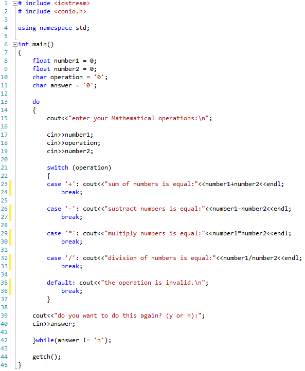 برخلاف بقیه دستورهای کنترلی (که در ادامه خواهید دید)، دستور switch دارای شرطی نیست و فقط یک متغیر را به عنوان ورودی میپذیرد و تمام تغییرات بر مبنای آن متغیر صورت میگیرد؛ در این برنامه ما میخواستیم بر خلاف برنامههای قبل که فقط توانایی انجام یک کار را داشتند (مثلا فقط اعداد را جمع میکردند) امکان انجام چند کار را بر حسب نیاز کاربر، به برنامه بدهیم؛ در این برنامه پس از این که کاربر عملیات خود را در برنامه وارد کرد، برنامه پس از تشخیص اینکه متغیر operation دارای چه مقداری است دستورهای مختلفی را انجام میدهد، که تمام این دستورات درون بدنه دستور switch نوشته میشود؛ برای درک بهتر این برنامه، کار کامپایل برنامه را از بالا تا پایین توضیح میدهم: