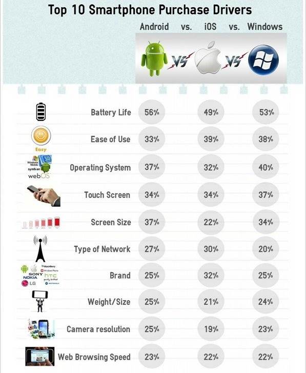 طبق آخرین نظرسنجی که شرکت تحقیقاتی IDC میان 50هزار نفر در 25کشور دنیا انجام داده است، مشخص شد که دغدغه اصلی کاربران برای خرید یک اسمارتفون، میزان شارژدهی آن است. در این نظر سنجی ابتدا از افراد جهت خرید اسمارت فون جدید سوال شده بود که حدود 40درصد از آنها مایل به خرید یک اسمارت فون ویندوزفونی بودند! این آمار برای آیاواس در حدود 32 و اندروید بیش از 37 درصد است. با توجه به این نظر سنجی 53درصد کاربران ویندوزوفون و 56درصد علاقه مندان به اندروید به دنبال اسمارتفونی با عمر باتری بالا هستند. نکته جالب توجه در این آمار، این است که در حدود 32 درصد علاقه مندان به سیستم عامل آیاواس صرفا به دلیل اعتبار و برند اپل، حاضر به خریداری اسمارتفون هایی با این سیستم عامل هستند. در بخش استفاده آسان از دستگاه، آیاواس با 39 و ویندوزفون با 38 درصد پشت سر هم قرار گرفتهاند، همین آمار برای اندروید که 33 درصد از آرای علاقه مندان را به خود اختصاص داده، کمی نگران کننده است! اما در بخشهای دیگری نظیر دوربین، مرور وب و سایز صفحه نمایش همچنان اندروید در صدر قرار دارد.