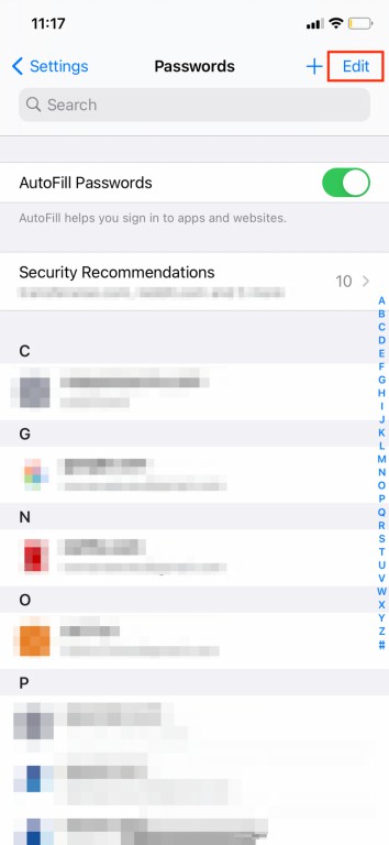 - جهت اعمال تغییرات در پسوردها باید در گوشه بالا سمت راست صفحه، “Edit” را لمس کرده و سپس پسوردی را که میخواهید حذف کنید، انتخاب نمایید.