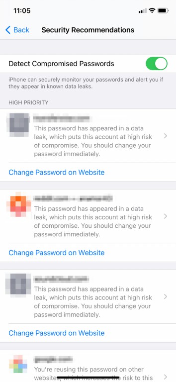 جهت پیدا کردن پسوردهای در معرض خطر قرار گرفته در آیفون خود، باید به “Settings > Passwords > Security Recommendations” بروید. در ادامه میتوانید بهسادگی پسورد نامطمئن خود را تغییر دهید. جهت انجام این کار نیز کافی است که “Change Password on Website” را لمس کنید.