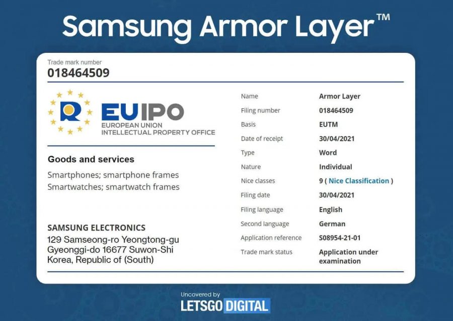 سامسونگ پیشتر برای پوششها، لایهها و روکشهای محافظ فریم اسمارتفونهای خود نمادهای تجاری متعددی را در سراسر جهان به ثبت رسانده است. یکی از این نمادها Armor Frame نام دارد؛ این مشخصه بهطور اختصاصی برای قاب اسمارتفونها طراحی شده و احتمالا در برابر خراشیدگی مقاوم خواهد بود. نماد تجاری دیگر Pro-Shield نام دارد و موارد کاربری آن به اسمارتفونها و اسمارتواچها مربوط میشود. بهنظر میرسد که کارکرد این مشخصه مشابه فناوری Ceramic Shield شرکت اپل است. بعلاوه سامسونگ نمادهای تجاری Armor Skin و Armor Layer را نیز به ثبت رسانده است. Armor Layer احتمالا نوعی لایه محافظ برای نمایشگرهای تاشو بهشمار رفته و به سامسونگ امکان میدهد تا بدون ایجاد خراش روی نمایشگر از قلم S Pen در گوشیهای تاشو خود استفاده کند.