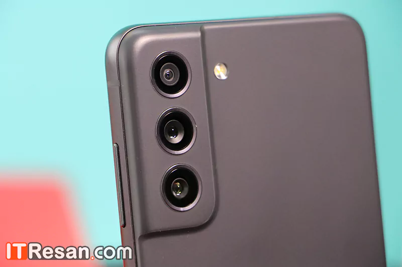 در گوشی S21، فریم دور گوشی حالتی خمیده به خود گرفته تا به برآمدگی دوربینها وصل شود و حس یکپارچگی را منتقل کند اما در S21 FE حتی بخش نگهدارنده ماژول دوربین هم از جنس پلاستیک بوده و کاملا مجزا از فریم دیده میشود. در کنار برآمدگی دوربین سهگانه، یک فلاش قرار دارد که به تنهایی بر روی بدنه پلاستیکی قرار گرفته است.