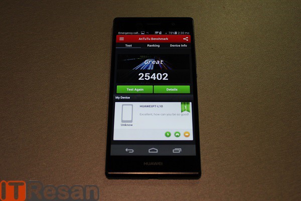 سپس به سراغ بنچمارک AnTuTu رفتیم تا یک امتیاز کلی به سوگلی هواوی داده شود! پس از گذشت مدت زمان قابل توجهی 25402 بر روی صفحه نمایان شد! در زیر رتبه پی 7 را در میان رقبا مشاهده میکنید (سعی شد در نمودار ها یک مدل هم سطح با پی 7 و یک مدل پرچمدار را قرار دهیم تا بتوانید جایگاه این مدل را میان رقبا بهتر تشخیص دهید).
