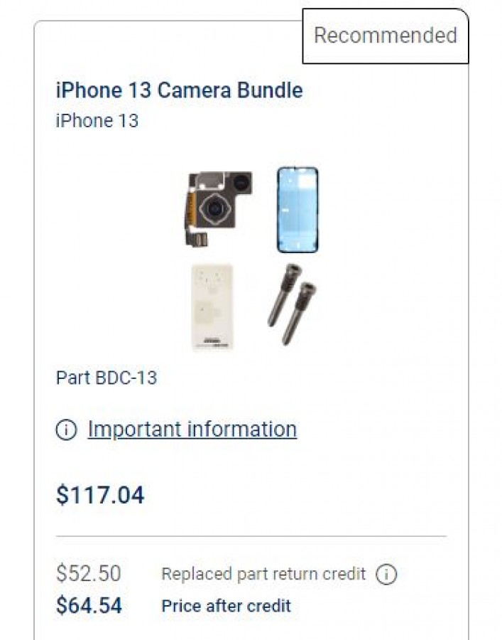 فروشگاه Self Service Repair دارای قطعاتی نظیر نمایشگر، باتری، اسپیکر، ماژول‌های دوربین، سینی سیم‌کارت، موتور لرزشی Taptic و مجموعه‌ای از قطعات یدکی متفرقه شامل پیچ، مهره و آچار است. قیمت‌گذاری قطعات بسته به نوع دستگاه متغیر بوده و به‌عنوان مثال پکیج نمایشگر آی‌فون 13 شامل صفحه‌نمایش، کیت پیچ‌های مخصوص، چسب و پیچ‌های امنیتی) با قیمت‌گذاری 269.95 دلار عرضه شده و پکیج باتری یدکی نیز 70.99 دلار قیمت‌گذاری شده است. ارسال نمایشگر قدیمی برای فروشگاه، اعتبار 33.60 دلاری را برای کاربران به ارمغان آورده و مرجوع نمودن باتری قدیمی نیز درآمد 24.15 دلاری را به‌همراه خواهد داشت.