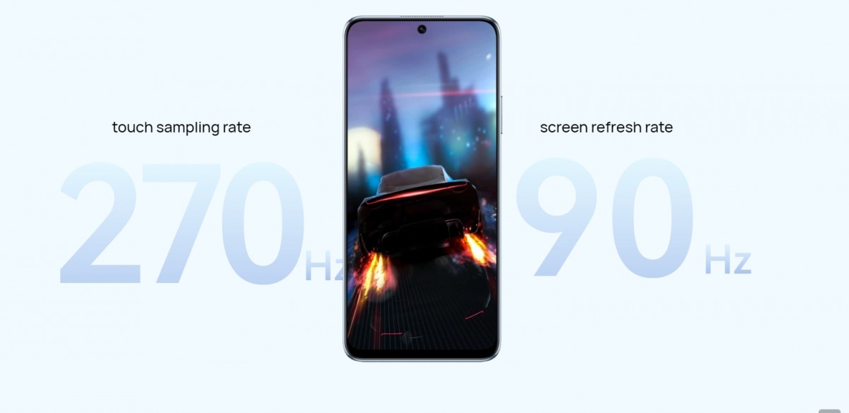 پنل جلویی دستگاه از یک نمایشگر 6.7 اینچی LCD با رزولوشن فول اچدی پلاس، نرخ نوسازی 90 هرتزی و نرخ نمونهبرداری لمسی 270 هرتزی میزبانی میکند. حفره کرویشکل تعبیه شده در مرکز قسمت فوقانی نمایشگر از یک سنسور منفرد 8 مگاپیکسلی در پشت لنزی با گشودگی دیافراگم f/2.0 میزبانی میکند.