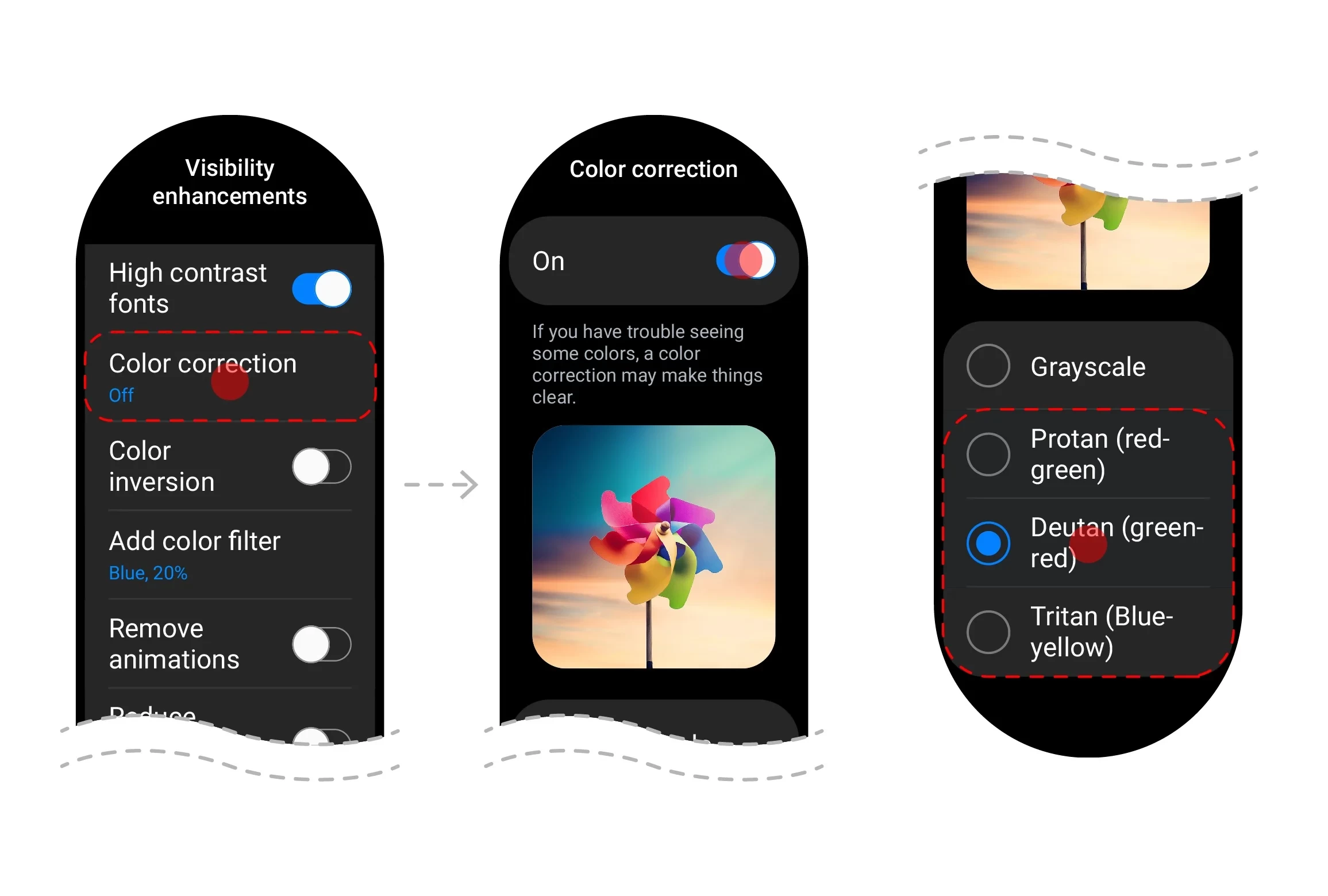 اصلاحات رنگی اعمال شده موجب بهبود وضعیت دید خواهد شد؛ در حالیکه اصلاحات شنیداری نیز به بهبود قابلیت دسترسپذیری کمک خواهد کرد. همچنین کاربران به منظور سفارشیسازی تنظیمات ناوبری خود میتوانند مدت زمان تاخیر لمس و نگه داشتن و همچنین مدت زمان زدن ضربه روی نمایشگر ساعت را تعیین نمایند. با توجه به حذف حاشیه چرخان فیزیکی از سری گلکسی واچ 5 این مشخصه بسیار مفید واقع خواهد شد.