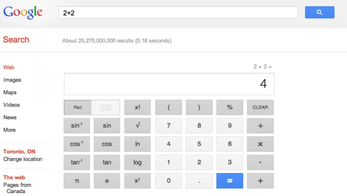 این بار میخواهیم شما را از یک سرویس گوگل که مدتهاست فعال است اما شاید از آن خبر نداشته باشید، مطلع سازیم. برای دسترسی به این قابلیت فقط کافی است در بخش تایپ موتور جستجو این عبارت را تایپ کنید: 2 + 2. بله، پس از همین سه حرف یک ماشین حساب جالب برای شما نمایش داده میشود. این ماشین حساب کامل یا به عبارت دیگر ماشین حساب مهندسی با کدهای HTML5 نوشته شده است. البته نمونههای قبلی از حساب کتاب در گوگل معرفی شده بود مثل تبدیل واحد پولی، تبدیل تاریخ و موارد دیگر اما این حرکت جدید خیلی جالب به نظر میرسد (مرورگرتان باید به روز شده باشد).